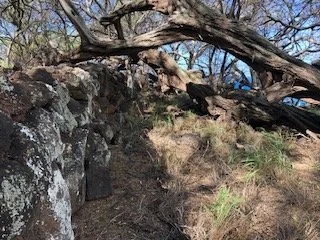 Alongside the ocean we hiked onto land that is a whirl of smells: old kiawe forest trees float whisps of leaf and bark and residual rain scents from baking in high heat sun; ankle-level drying shrub on reddish brown earth evokes dusty earth, richly aromatic and wary from all the direct Hawai’i sun; and salty air from the ocean so close mists everything. Taking a sharp turn to hike directly towards the ocean, we still had a quarter mile or so to cover before arrival. Bell kept pausing and checking in: is this where the ancients are? I had been talking aloud continually with her that soon our discovery might or possibly or perhaps or maybe could happen. My dog Bell is and continues to be a believer in sauntering walks, having earned her faithful trust over the last two years. She knows my talking aloud is a kind of chanting with nature.