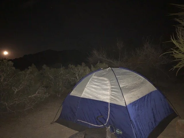 I had the willingness to be here in the desert, no expectations for me from others or from me for others, which keeps me lightly open. What might I learn in the desert so wonderfully alive if looking past the obvious? A gently swaying lantern keeps my tent lit up while I read Estes inspiring prose during this nighttime.